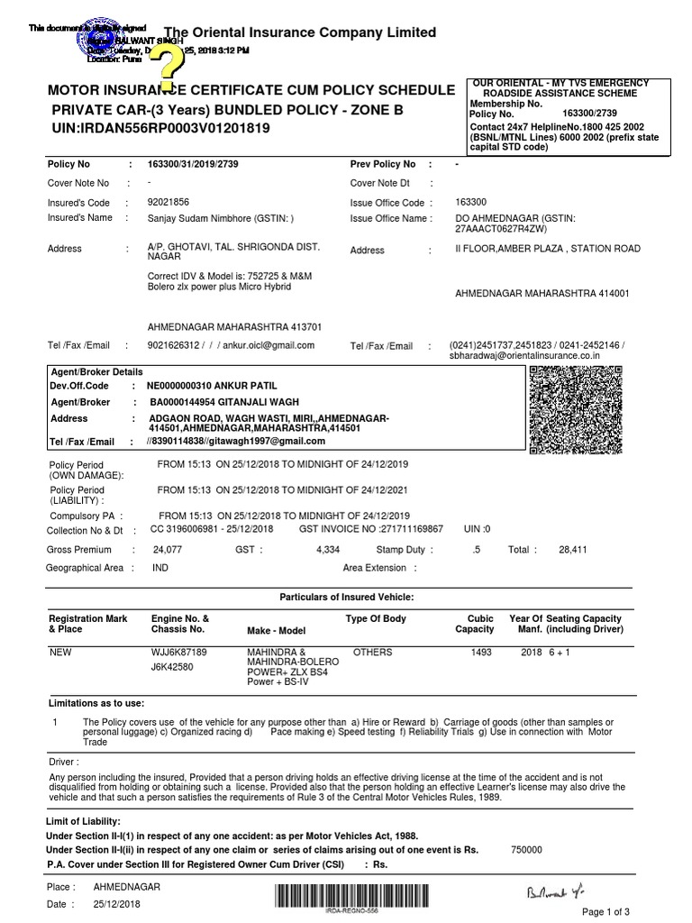 Oriental Insurance Motor Policy Done On Portal Deductible